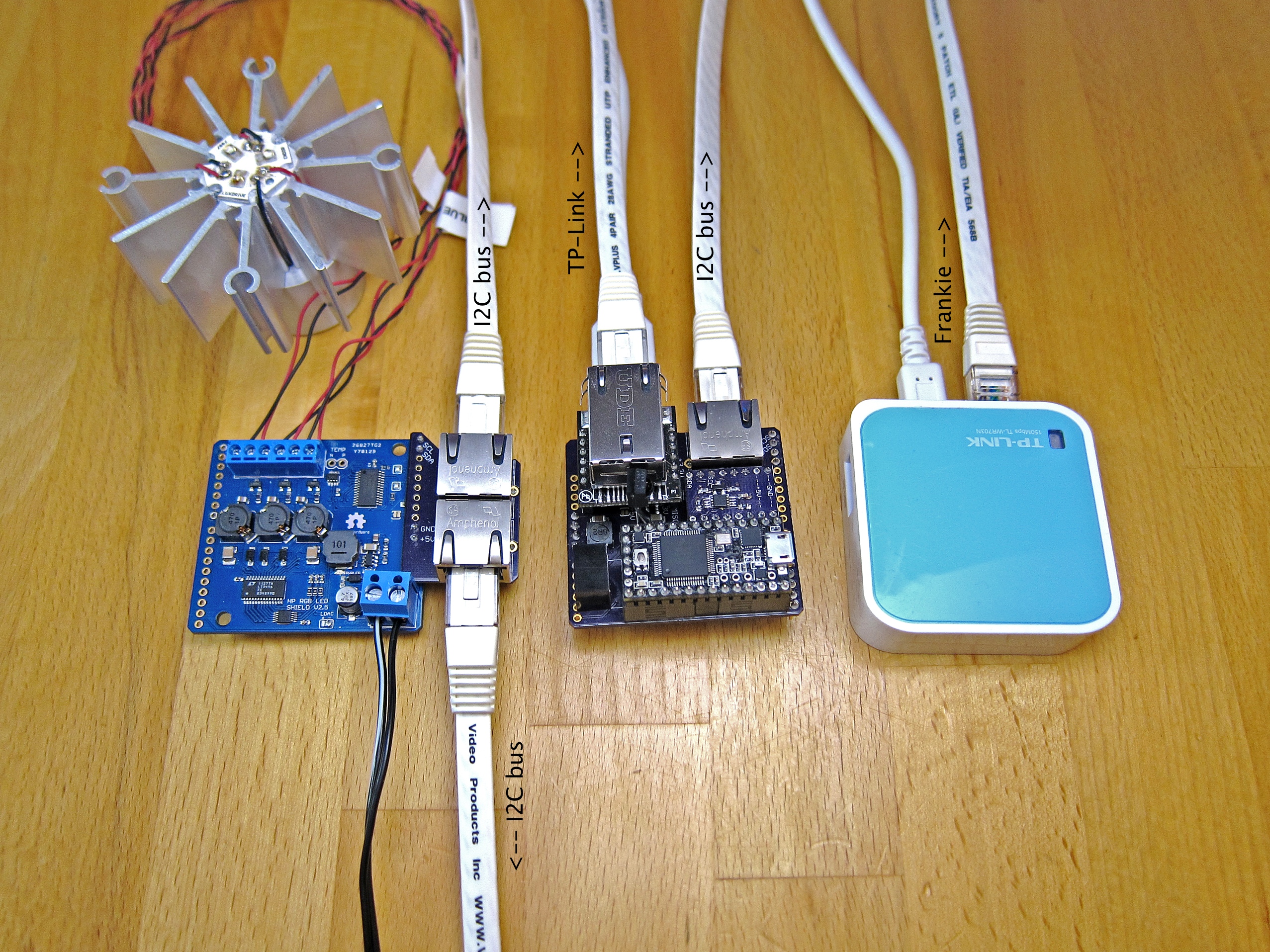 In order to function together with the I2C bus extender I also re-designed the little Arduino I2C extender board. It has SMD pads for different pull-up resistors and also needs a small Schottky diode when operated in conjunction with the PCA9600 I2C bus extender. Below is a picture of a “complete” system, including a micro controller, WiFi Ethernet Hub for remote control ability through OSC / TouchOSC and a LED shield with the I2C extension board. More shields can simply be daisy chained onto each other using inexpensive pre-configured CAT5 Ethernet cable.