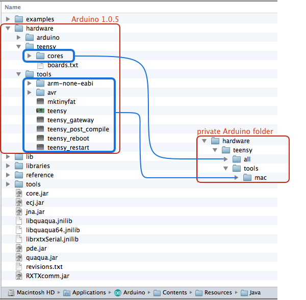 Note: for Windows users the folder name “mac” needs to be replaced with “windows” and for Linux users the folder name needs to be “linux”. - Download and install Arduino 1.0.5 and the latest version Teensyduino which is RC 18.2 at the time of this writing.
